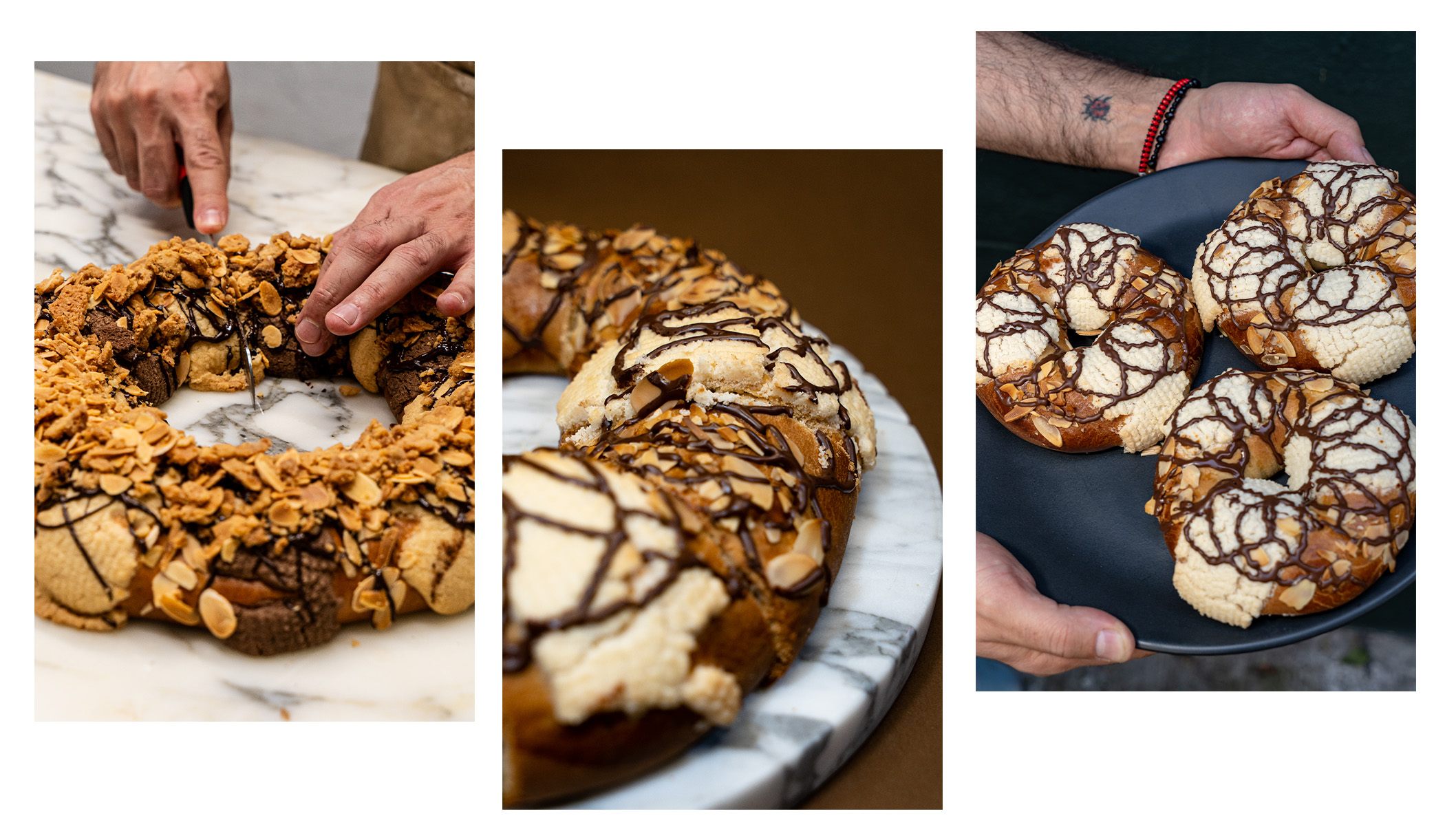 La magia reside en los detalles. Cardín propone una base de pan de naranja y cardamomo, cuya fragancia cítrica y especiada rompe con lo convencional. El corazón de esta pieza resguarda un relleno de mazapán de almendra, una textura untuosa que eleva el perfil de sabor a niveles sofisticados. La decoración es un espectáculo visual: una costra de chocolate y vainilla, hilos de chocolate derretido y un crujiente crumble de almendra. Para los coleccionistas de detalles, cada rosca incluye figuras de axolotes ocultas entre los tradicionales niños de colores.