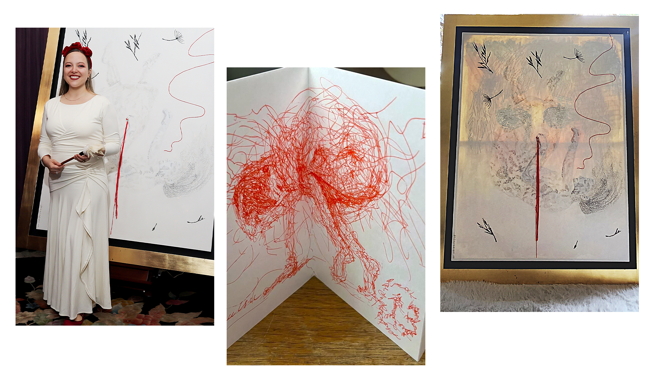 La propuesta, curada sobre un altar de pergamino lacado, reinterpretó la leyenda del hilo rojo integrando reliquias y esculturas de Kanjis de la residencia de la artista en Japón. La activista María Teresa Ealy inauguró el acto cortando el primer hilo, desatando un «efecto dominó» poético. Figuras como Verónica Salame y Gonzalo Cortés tomaron las tijeras rojas para romper simbólicamente las ataduras del trauma, transformando el espacio en un manifiesto de justicia y sanación social.