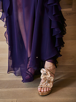 Para la colección Artemis, se diseñaron dos siluetas de sandalia, una de piso con tacón de bloque y otra plataforma con tacón estilizado. Delicados straps infinitos de piel acolchada, dan vida a la parte superior de las sandalias, abrazando y envolviendo al pie de forma estilizada y cómoda.