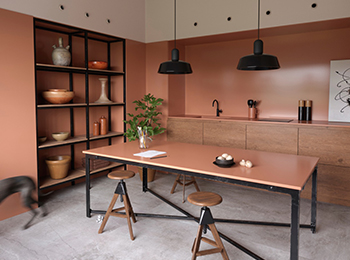 - El rojo puede ser ecléctico, sólo hay que bajarle la intensidad, al infundirlo con un velo terroso que genera Silestone® Arcilla Red. Te permitirá crear un entorno rustico encantador, sólo hay que mezclarlo con elementos de maderas rojizas con el cedro o la antracita que tiene un ligero viso gris. Para dar un aspecto particular, utiliza tejidos hechos a manos en ciertos detalles de la decoración, esto te permitirá generar un espacio con carácter rústico y bohemio.