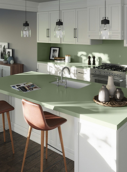 - El verde, es una apuesta que continua pues fácilmente te sumergirá en la tranquilidad que transmite la naturaleza. Aunque no lo creas brinda profundidad y vitalidad, además de optimismo. Elige la serenidad de Silestone® Posidonia Green que parece ser una opción viable, al combinarlo con maderas como el bambú y fibras como el algodón o el lyocell. Simplemente se sentirá como un refugio, apartado del caos cotidiano.
