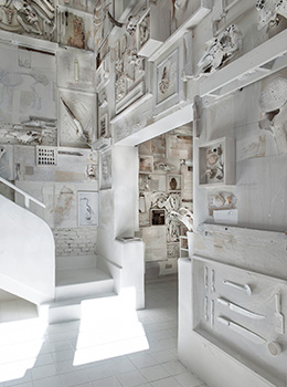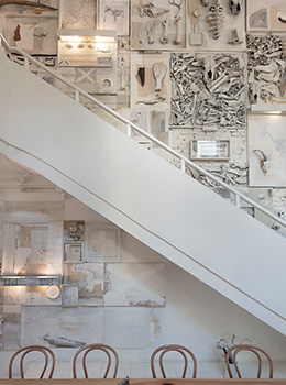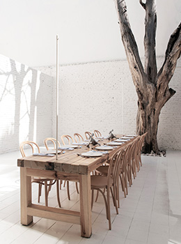Al ingresar la decoración está armada con huesos de animales de todo tipo, montados sobre diferentes piezas de madera, combinados con plantas y alternando utensilios de cocina pintados con una gama de diferentes blancos y grises que aportan frescura.