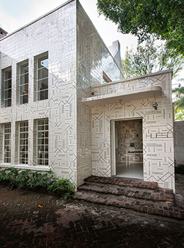 El restaurante Hueso que ofrece cocina de autor, se encuentra ubicado en Guadalajara. La visita sorprende desde el exterior, pues la fachada está inspirada en una “visión darwiniana” y la recubrieron con una perfecta cuadrícula de azulejos de cerámica con motivos que recuerdan a las puntadas de costura y que preparan para las escenas en el interior.