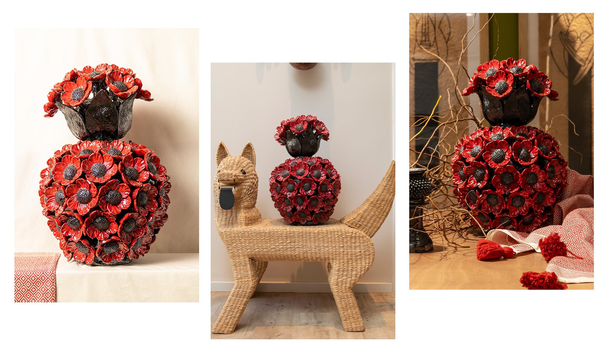 La joya de la corona es la Piña de Amapolas. Cada flor de esta pieza escultórica ha sido modelada y esmaltada a mano, convirtiendo la fragilidad de una flor en un objeto eterno. El esmalte profundo realza los matices vibrantes del rojo, creando una presencia magnética en cualquier habitación. Es la esencia de Huakal: piezas únicas donde la maestría artesanal y la emoción se encuentran para crear un hogar con personalidad propia.