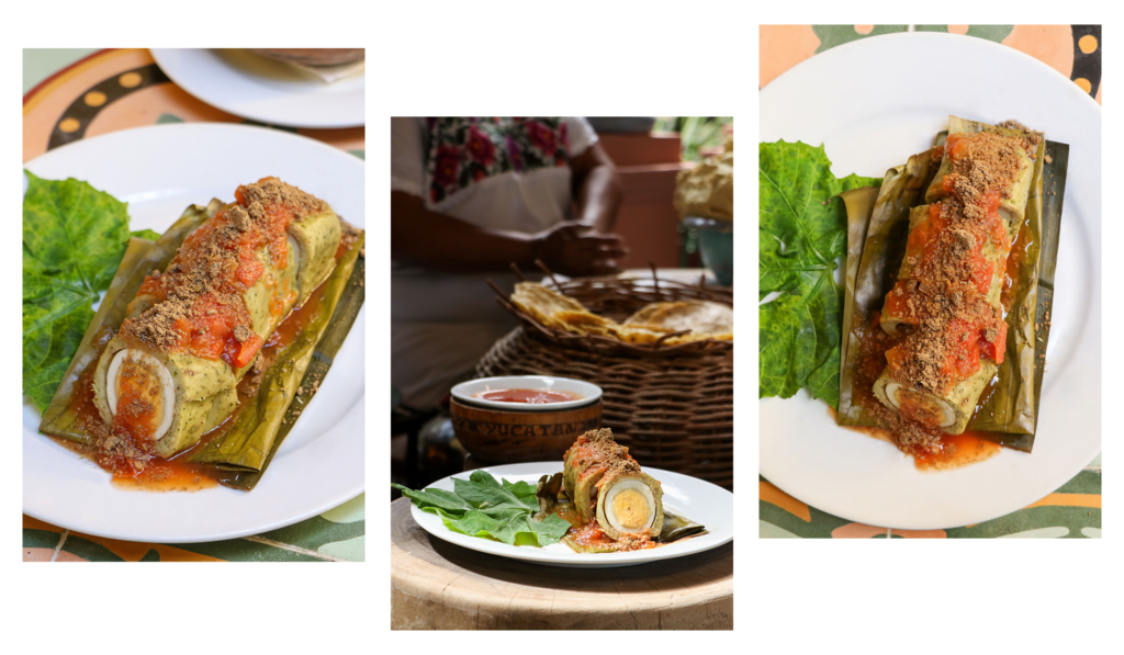 Durante su preparación, la masa se mezcla con sal, huevo cocido, hojas de chaya previamente blanqueadas (pasadas por agua hirviendo) y sikil pak, una botana propia de la cocina yucateca; elaborada con la pepita de calabaza molida, tomate rojo, chiles verdes, cebollín y cilantro, que le dan un aroma apetitoso, para finalmente, envolverse en hoja de plátano para su cocción al vapor.